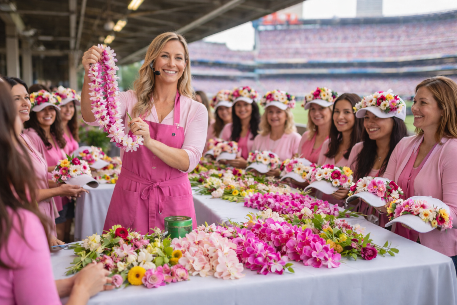 Program: florist-led lesson for ~120 guests all together in one space (pink/white leis + add a few flowers to a team hat)